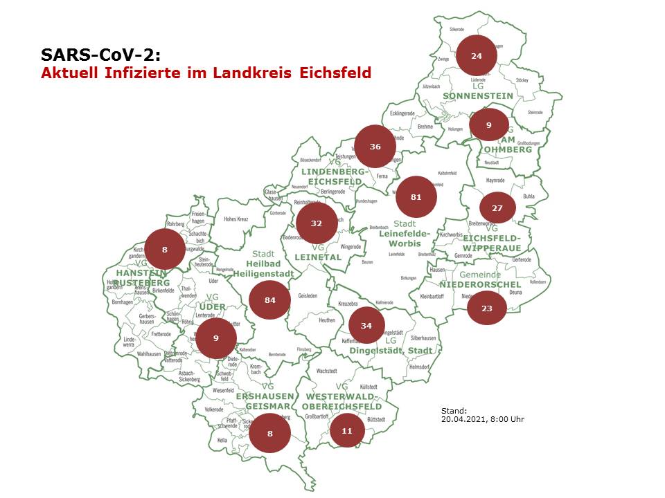 Auf die Städte, Landgemeinden und Verwaltungsgemeinschaften verteilen sich die 386 Infizierten am 20.04.2021 wie folgt: