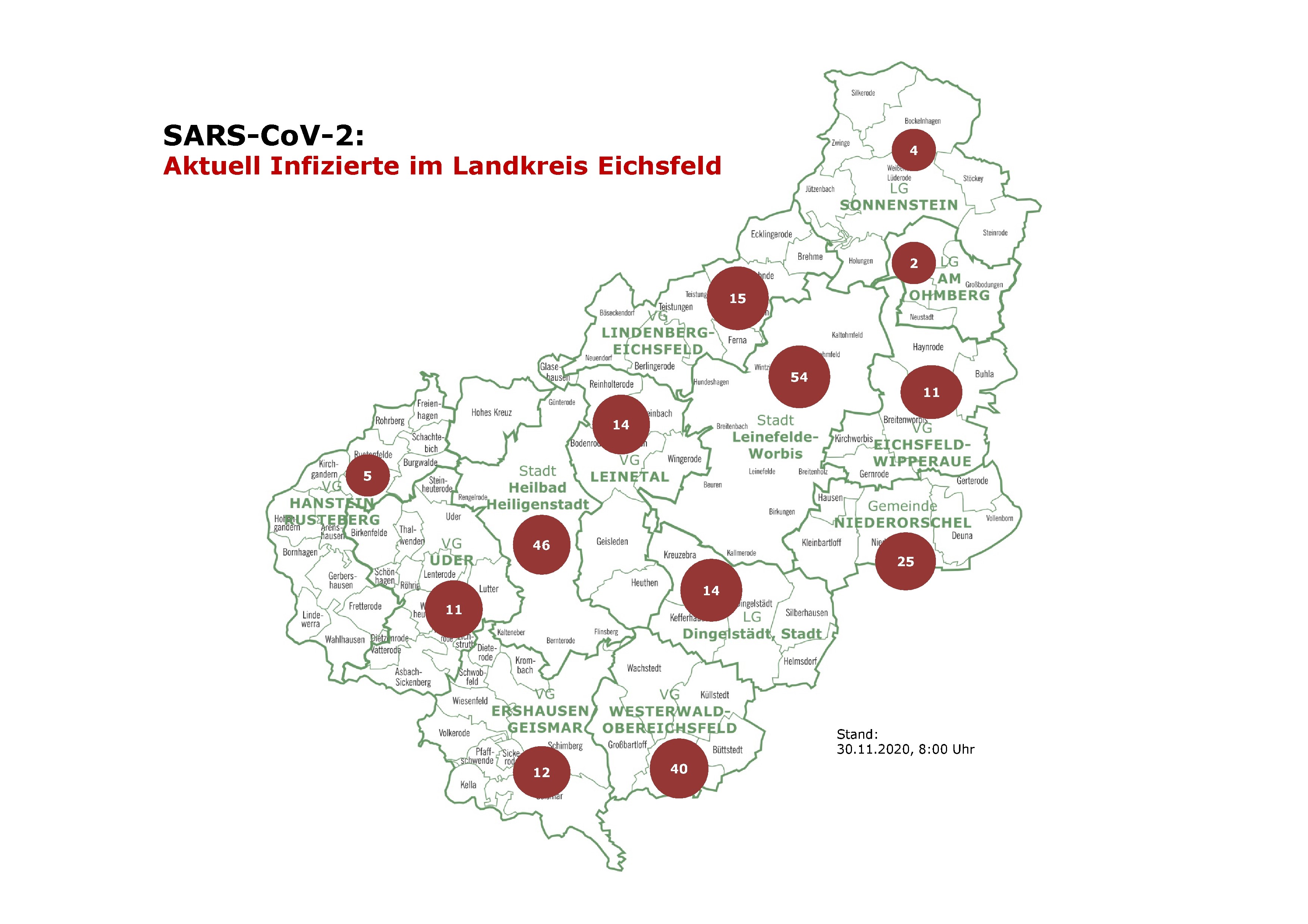 Bei elf Infizierten konnte eine konkrete örtliche Zuordnung in der Statistik bis zum 30.11.2020, 08:00 Uhr, noch nicht erfolgen.
