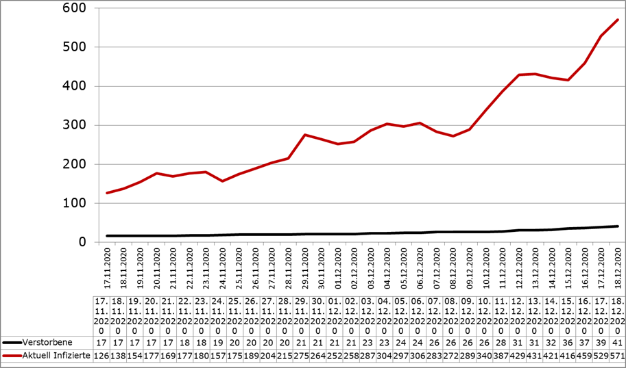 Nachfolgend erhalten Sie die aktuellen Fallzahlen und eine Darstellung der Altersstruktur der Infizierten: