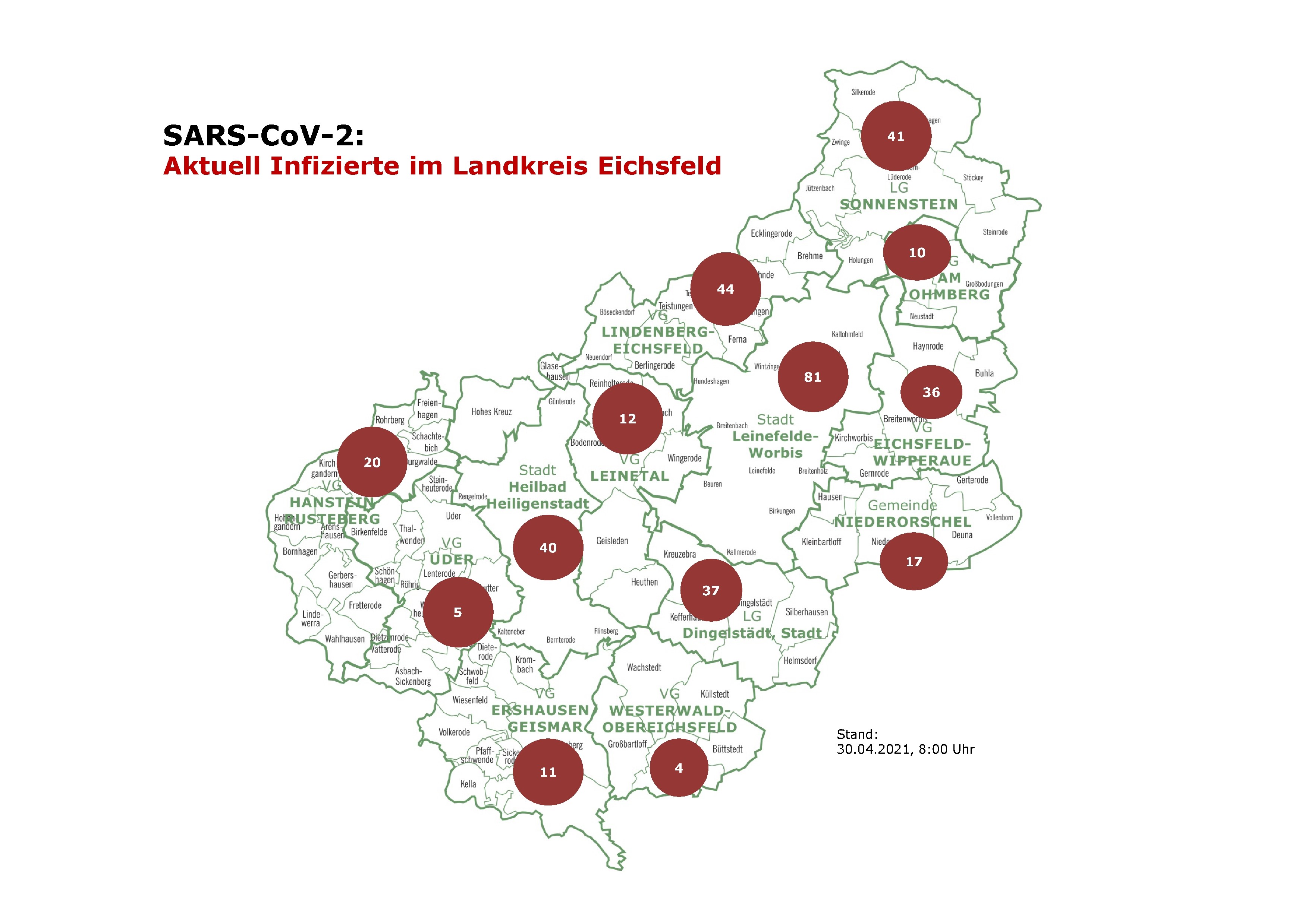 Auf die Städte, Landgemeinden und Verwaltungsgemeinschaften verteilen sich die 358 Infizierten am 30.04.2021 wie folgt: