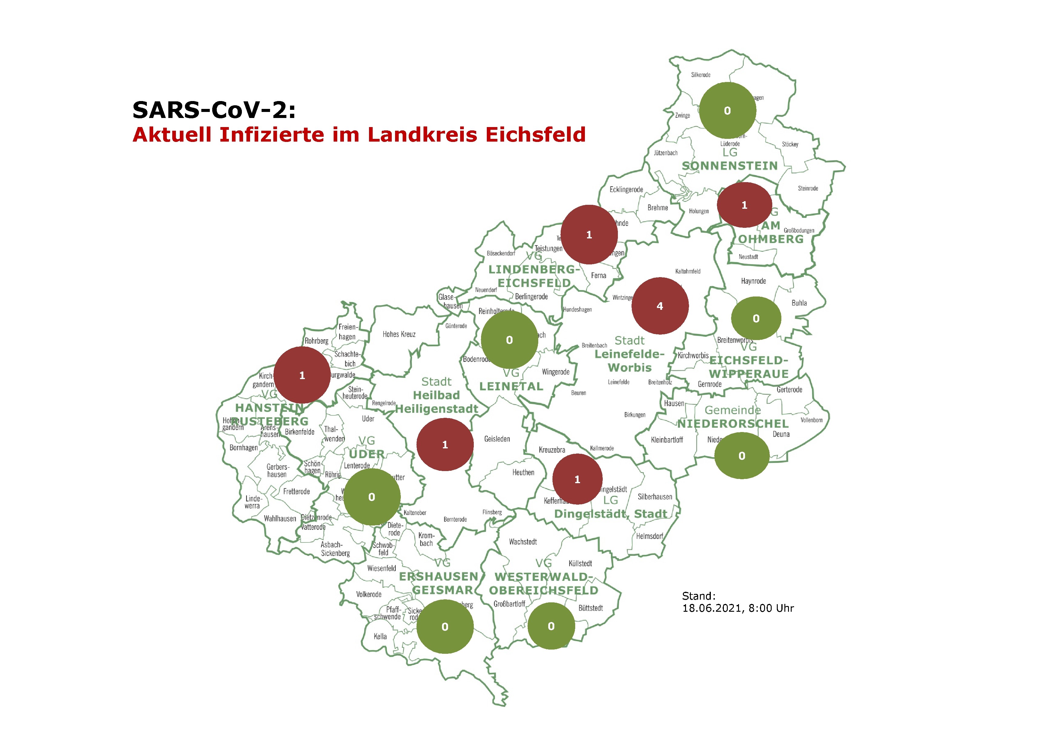 Auf die Städte, Landgemeinden und Verwaltungsgemeinschaften verteilen sich 9 Infizierte am 18.06.2021 wie folgt: