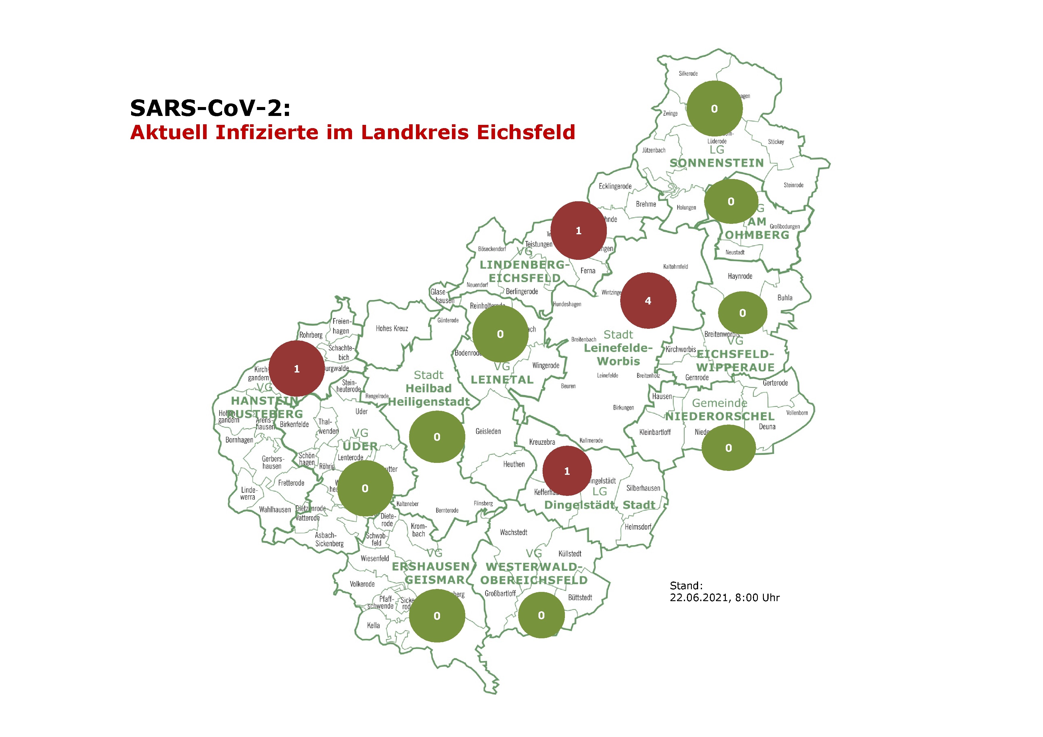 Auf die Städte, Landgemeinden und Verwaltungsgemeinschaften verteilen sich 7 Infizierte am 22.06.2021 wie folgt: